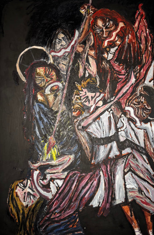 These paintings function as modern history paintings they don’t preserve perfection, but question it. Traditional scenes are replaced with speculative ones: new prophecies painted as if they have already occurred, drawing on imagery from the Book of Revelation.